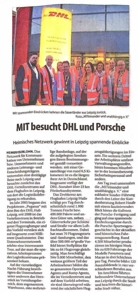 HEMER/ISERLOHN. Das Netzwerk für Kommunikation von Unternehmen bzw. Unternehmern und anderen Leistungs- und Entscheidungsträgern unternahm eine dreitägige Reise nach Leipzig und besuchte zunächst das DHL-Verteilzentrum auf dem Flughafen in Leipzig, um dort die Logistikabfertigung zu erkunden. Im Jahr 2005 begann das Projektteam“Pegasus“ mit dem Bau des DHL Hub Leipzig, seit 2008 ist das Verteilzentrum in Betrieb und drei Terminals, ein eigener Flugzeughangar und das Vorfeld verteilen sich auf insgesamt zwei Millionen Quadratmeter. Das Unternehmensnetzwerk erlebte eine interessante Tour, auf der man die operativen Arbeitsprozesse des Logistikzentrums präsentiert bekam.