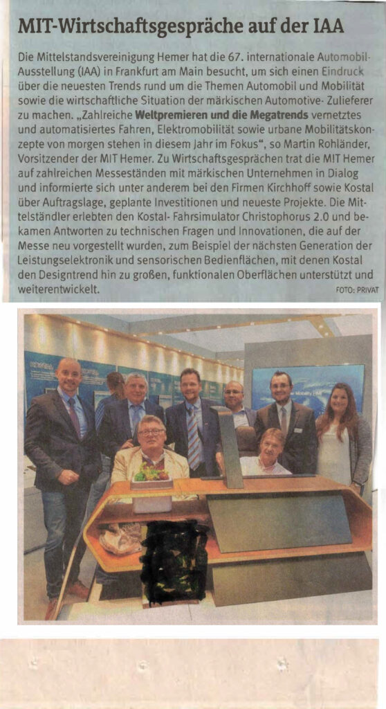 Die Mittelstandsvereinigung Hemer hat die 67. internationale Automobil-Ausstellung (IAA) in Frankfurt am Main besucht, um sich einen Eindruck über die neuesten Trends rund um die Themen Automobil und Mobilität sowie die wirtschaftliche Situation der märkischen Automotive-Zulieferer zu machen. „Zahlreiche Weltpremieren und die Megatrends vernetzes und automatisiertes Fahren, Elektromobilität sowie urbane Mobilitätskonzepte von morgen stehen in diesem Jahr im Fokus“, so Martin Rohländer, Vorsitzender der MIT Hemer. Zu Wirtschaftsgesprächen trat die MIT Hemer auf zahlreichen Messeständen mit märkischen Unternehmen in Dialog und informierte sich unter anderem bei den Firmen Kirchhoff sowie Kostal über Auftragslage, geplante Investitionen und neueste Projekte. Die Mittelständler erlebten den Kostal-Fahrsimulator Christophorus 2 .0 und bekamen Antworten zu technischen Fragen und Innovationen, die auf der Messen neu vorgestellt wurden, zum Beispiel der nächsten Generation der Leistungselektronik und sensorischen Bedienflächen, mit denen Kostal den Designtrend hin zu großen, funktionalen Oberflächen unterstützt und weiterentwickelt.